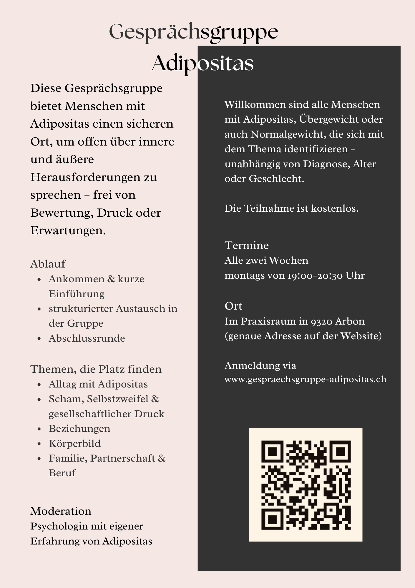Diese Gesprächsgruppe bietet Menschen mit Adipositas einen sicheren Ort, um offen über innere und äussere Herausforderungen zu sprechen - frei von Bewertung, Druck oder Erwartungen.